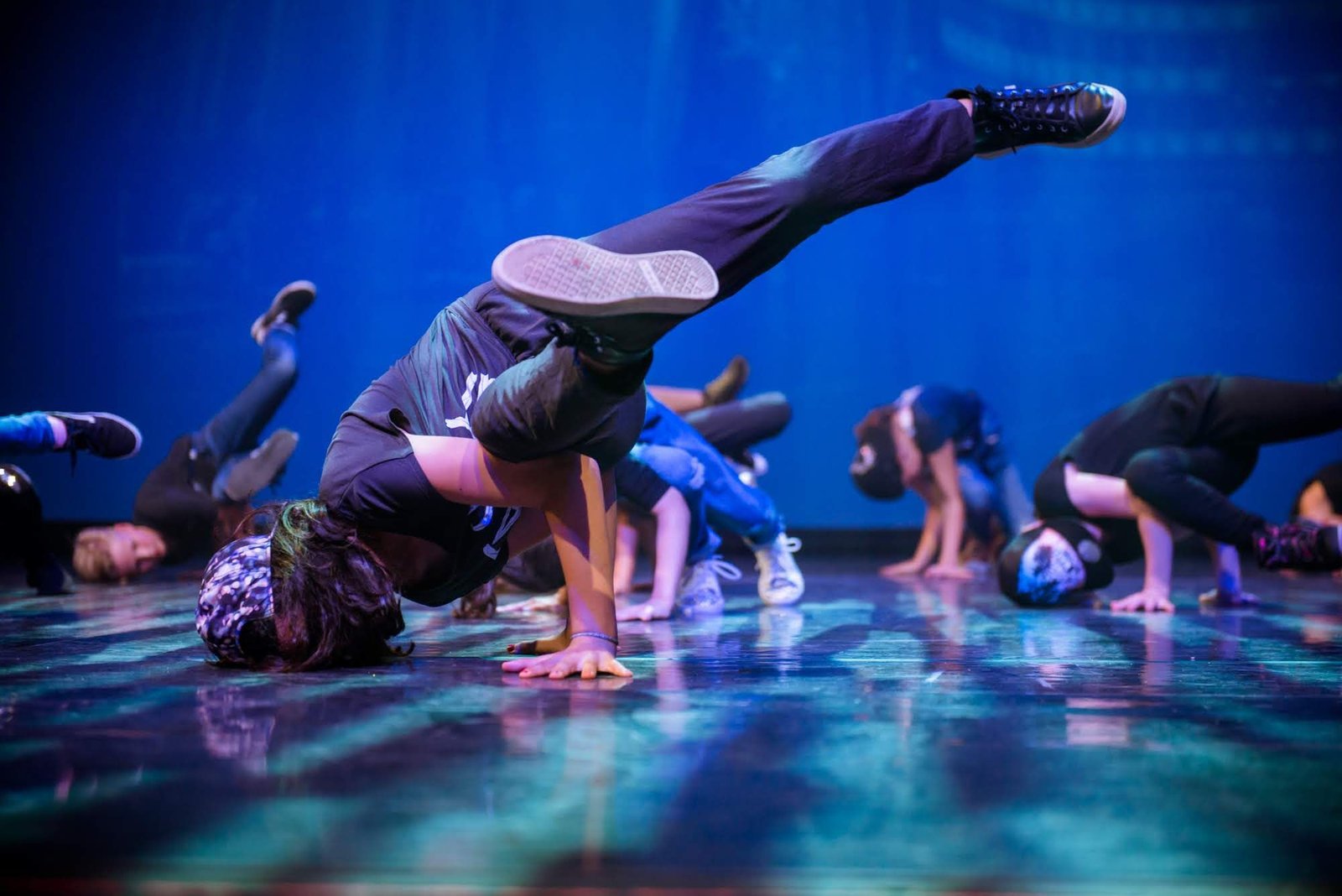 WarmUp und aufbauende Choreographien mit Elementen aus Akrobatik, Hip Hop, Top-, Down-und Uprocks, B-Boying, B-Girling, Freezes